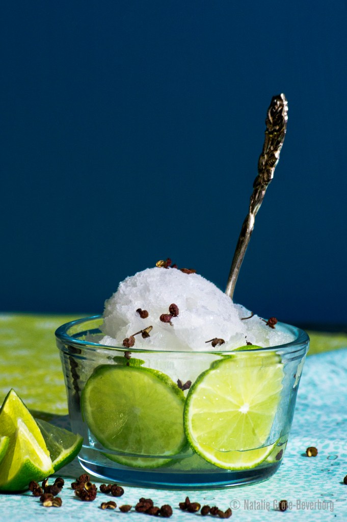 Once its frozen completely, blend again so you have a smooth sorbet and garnish with the szechuan pepper.