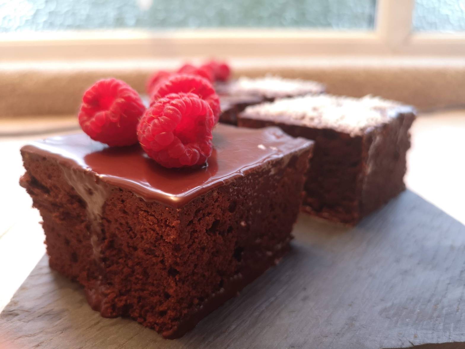 Now comes the worst part: Let it cool down for at least four hours, then cut it. You can glaze the brownies by warming up the leftover chocolate with a teaspoon of coconut oil and then just pour it over the surface of your brownies.