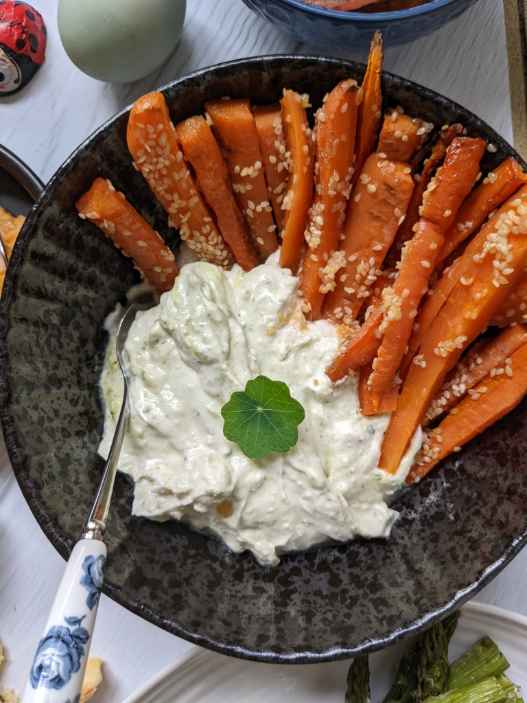 First, preheat your oven to 200 degrees, then clean your carrots and cut them in finger sized chunks. Add them to a lined baking tray, with the butter, the sesame oil, the sesame seeds and a sprinkle of salt. Put them in the oven and bake them for 25 minutes. In the meantime, add the mayonaise, the feta cheese, the garlic, lemon zest and juice of the lemon to your blender and blend. Slowly add the yoghurt and keep on blending, until you have a creamy dip.